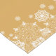 This Christmas holiday table runner is shown with a gold background colour and has a festive Christmas white snowflakes print design.