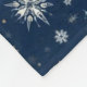 Fleece blanket in a holiday themed toile pattern of snow covered evergreens. deer and scattered snowflakes, on a deep, midnight blue background