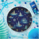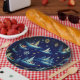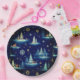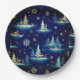 Paper plates in a holiday themed toile pattern of snow covered evergreens. deer and scattered snowflakes, on a deep, midnight blue background
