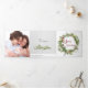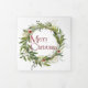 The cover of this trifold Holiday greeting card has a pretty green watercolor Christmas wreath embellished with dark blue black and red berries. At the center is the stylized text "Merry Christmas". Inside, there are photo templates on the first and third panel. The middle panel has your custom text in green and red contained in four fields. The back contains another photo template and a matching green watercolor branch. Simple elegance!