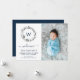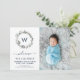 A photo greeting card that sends a lovely message of a newborn baby to family and friends. It has holiday greenery wreath and personalised text.