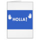 Famous Blue background with “Holla” printed in white & 2 hands raising the roof on the side.