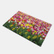 A field full of Dutch tulips. At the bottom of the picture spring the green stems of the first row of tulips, with the flowers on top. From there on, to the far, blurry background, just flowers... only tulip flowers in many colours. From yellow, to red, to purple, to pink. Typical sight in The Netherlands. On top of the green stems, the word Holland.
