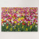 A field full of Dutch tulips. At the bottom of the picture spring the green stems of the first row of tulips, with the flowers on top. From there on, to the far, blurry background, just flowers... only tulip flowers in many colours. From yellow, to red, to purple, to pink. Typical sight in The Netherlands. On top of the green stems, the word Holland.