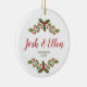 Holly Berries Greenery Personalised Engagement Ceramic Ornament. Personalise with your custom information on both front and back.