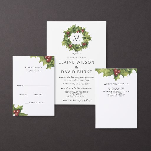Holly Berries Wreath Monogram Christmas Winter Wedding Invitation