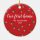 Holly Berry Sprigs Personalised Our First Home Red Ceramic Ornament. Personalise with your custom information on both front and back.