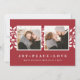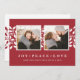 Simple and elegant holiday photo card features two favorite square photos on a festive red background with white holly leaves and berries. Personalize with a Christmas or holiday greeting (shown with "joy, peace, love") and your names beneath, in classic white lettering. Add an additional photo to the back, along with the year or a personal message.