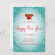 Cute red ribbon and holly berries over gradient blue background with snowflakes