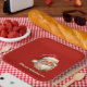 Paper plates with a joyful illustration of a vintage style Santa Claus with red rosy cheeks. wearing his classic red Santa hat and his big white bear. A sprig of holly adds to the festive holiday spirit of this design.