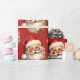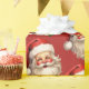 Wrapping paper with a joyful illustration of a vintage style Santa Claus with red rosy cheeks. Wearing his classic red Santa hat and his big white beard. A sprig of holly adds to the festive holiday spirit of this design.