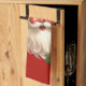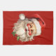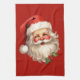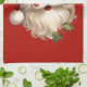 A kitchen towel with a joyful illustration of a vintage style Santa Claus with red rosy cheeks. wearing his classic red Santa hat and his big white bear. A sprig of holly adds to the festive holiday spirit of this design.