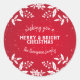 Holly Red and White Festive Stickers. Warm their hearts with this Festive Christmas Round Sticker with White Holly Branches and white text on a Red Background. The text reads: wishing you a merry & bright Christmas, and your family name. To personalise, simply insert your text into our easy template, replacing the sample text. This festive Holiday Accessory will brighten up your Christmas Holiday Cards and Packages.