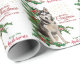 This pretty personalised Holiday gift wrapping paper shows a Siberian Husky dog sitting in front of holly sprigs loaded with red berries. The red text at the right says "MERRY Christmas AND HAPPY NEW YEAR". Your custom text is at the below that. A sprinkling of gold confetti in the background adds a bit of sparkle, and the pattern is repeated across the surface of the paper.