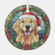 Here's a pretty glass ornament with a stained glass theme, featuring a happy Golden Retriever. The dog is wearing a red and white Santa Claus hat, with a blue sky background. The image is framed in a pretty green holly and red berry circle wreath. This is a high resolution, high quality image, and makes a nice stocking stuffer or decoration for the household who loves a Golden!