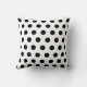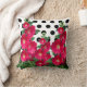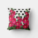 Throw pillow with image of wine coloured hollyhocks against a background of black and white polka dots.