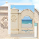 Ocean view from the Hollywood Beach Florida Broadwalk on a photographic tourism postcard. Looking through a window in the wall along the boardwalk, you can see the the sandy beach and the different shades of blue water and sky and just a hint of colourful beachgoers with their chairs. This is original seashore photography by JLW_PHOTOGRAPHY.
