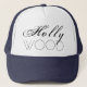 Black text Hollywood against the white background. Beautiful, one-of-a-kind, chic trucker hat for anyone. Stylish, decorative fonts. Customisable. You can change the template text. Use the button CUSTOMIZE to further personalise the hat. Do not forget to choose another colour of the background. Have fun!