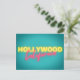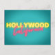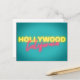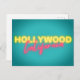 Vintage look typographic design features "Hollywood, California" in gold and pink neon text on aged / retro aqua background