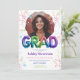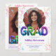 Celebrate the graduate in style with this vibrant and modern holographic balloon lettering graduation invitation. Featuring two customisable photo spots, this fun and festive design is decorated with shimmering confetti and eye-catching balloon text that spells "GRAD" in rainbow metallic hues. The rounded edges add a sleek touch, while the mix of playful and bold typography makes it a standout choice for any high school or college graduation celebration. Perfect for announcing the big milestone with a fun and energetic vibe!