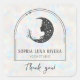 The design features an elegant silhouette of a woman within a crescent moon, surrounded by stars and framed in a minimalist arch. Beneath the celestial artwork, your name and studio title are displayed in refined typography, finished with a heartfelt “Thank you!” message. The subtle holographic background shimmers with iridescent light, making every package feel special and intentional.