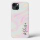 Modern Holographic Elegant Iridescent Rainbow Name iPhone Case. Personalise with a signature script font name. Features a trendy aesthetic holo background.