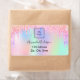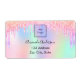 A trendy holographic background with unicorn colours and rainbow colours in pink, purple, rose gold, mint green. Decorated with faux glitter drips in rose gold, pink and purple. Personalise and add your business logo, name and address.