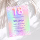 A girly and feminine 18th birthday party invitation. On front: A rainbow, holographic coloured background in purple, pink, mint green. Decorated with blush pink confetti. Personalise and add a name and party details. The name is written with a hand lettered style script, purple coloured letters.