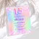 A girly and feminine Quinceañera party invitation. On front: A rainbow, holographic coloured background in purple, pink, mint green. Decorated with blush pink confetti. Personalise and add a name and party details. The name is written with a hand lettered style script, purple coloured letters.