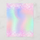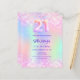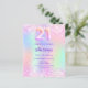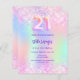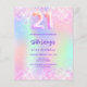A girly and feminine 21st birthday party invitation. On front: A rainbow, holographic coloured background in purple, pink, mint green. Decorated with blush pink confetti. Personalise and add a name and party details. The name is written with a hand lettered style script, purple coloured letters.