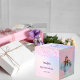 Pink, purple, mint green holographic background. Personalise and add 2 photos, name, age and a date. Text on the lid: Thank you for coming!