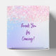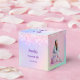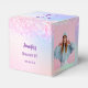 Pink, purple, mint green holographic background. Personalise and add 2 photos, name, age and a date. Text on the lid: Thank you for coming!