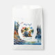 Funny fishing themed boy's baby shower favour bag. Funny fishing pun, Holy Carp, it's a boy. Cute little boy with fishing pole sitting next to his puppy dog by the lake, mountains and trees. These have a blue and green theme.