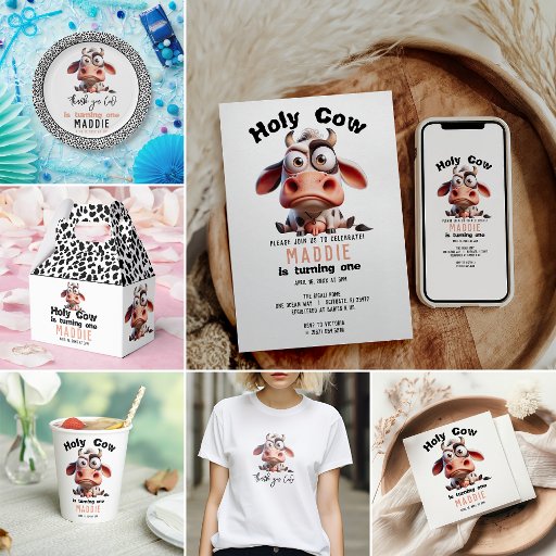 Yeehaw! Celebrate your little cowgirl’s first birthday with this adorable “Holy Cow, I’m One!” invitation. Featuring a cute cow print, fun caricature-style cow illustration, and playful Western vibes, it’s perfect for a barnyard or farm-themed party. Personalise with your party details for a unique touch. Saddle up for a rootin’ tootin’ good time with this cute and festive invite!