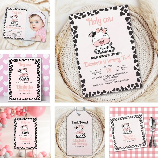 Celebrate your girl's birthday party with this cute cow-themed design! This adorable design features the image of a cute cow and the fun phrase "Holy Cow!" Personalize it with your party details and get ready for a delightful celebration. Order now for a unique and unforgettable birthday party!