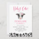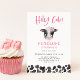 Cute farm theme girl's birthday party invitation card featuring watercolor illustration of a baby cow with a flower in her head. The text says "holy cow! XX is turning 1!"
