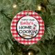 If you love retro then you'll love this cute ornament featuring a red check tablecloth background with a cute resizable 50's gal in a chef's hat. Text says HOME COOKIN'. Personalise it for your favourite chef. Make a gift set with our coordinated menu planner, recipe keeper, stationery, recipe cards, recipe keepers, apron, magnets, food labels and cookbook binder. PinkInkArt original!