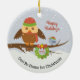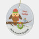 Embrace the holiday spirit with this customisable ornament that features a cute snowy owl and bluebird dressed in cosy hats and scarves. This design is accented with a festive Christmas wreath and freshly falling snow to add a touch of winter wonderland to your tree. Modify the three text areas that say, “Happy Holidays,” “Owl Be Home for Christmas,” and the current year to create a unique gift for family and friends.