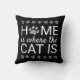 Add elegant style to your home decor and get cosy with this cute and funny graphic pillow featuring the words "home is where the cat is" in modern script typography including a metallic silver grey foil paw print for the "o" in "home" and walking paw prints over a black background.