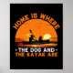 Colourful kayak design for anyone who loves kayaking with their dog! This kayak design features a person and his dog kayaking on a river with text that reads Home is Where The Dog and The Kayak Are!