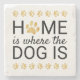 Add elegant style to your home decor and protect your furniture with this cute and funny graphic coaster featuring the words "home is where the dog is" in modern script typography including a metallic gold foil paw print for the "o" in "home" and walking paw prints.