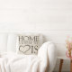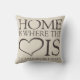A sweet family pillow with the expression "Home is where the heart is" and your custom family name printed in modern typography with a tustic vintage farmhouse look. The letters are printed in dark brown and the background of the cushion is in a light natural beige. A unique gift for a housewarming or a family occasion.