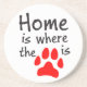 A wordplay with the quote "Home is where the heart is", this sandstone coaster has the words "Home is where the [paw print picture] is", with the paw print picture in red, representing the "heart". The perfect gift for pet lovers.