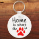 A wordplay with the quote "Home is where the heart is", this Home is where the paw print is White Keychain has the words "Home is where the [paw print picture] is", with the paw print picture in red, representing the "heart". The perfect gift for pet lovers.