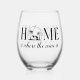 Cute wine glass - makes a perfect housewarming gift - that reads: "Home is where the wine is" where the letter "O" in the word home is represented by a beach house!