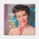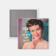 Kitschy fridge magnet has vintage 1950s style homemaker woman with "home is where the wine is" text.