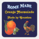 A custom sticker with vintage kitchen crate label art of oranges with small blossoms and a colourful crowing rooster. The top reads Home Made in custom letters in white with a blue outline, you add your ingredient title and name in retro orange curly letters. Click Customise It to add or subtract text, change lettering style, background colours, even save your custom canning label for later!