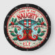 This is a playful, circular-framed graphic design with a humourous Christmas theme. The central image features the striped legs and red, curly-toed boots of a mischievous elf, set against a light blue background with snowflakes. Above the elf's legs, a banner proudly declares "HOME OF ONE NAUGHTY" in bold, red letters, with "ELF" at the bottom of the design. The entire scene is surrounded by festive holly, red berries, and candy canes, all enclosed within a red and white striped circular border. The overall aesthetic is cheerful, whimsical, and perfect for adding a touch of humour to holiday decor.