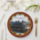 Paper plates with an old-fashioned train with a snow covered mountain in the background home for Christmas.