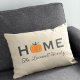 Welcome guests to your home this fall with an inviting personalised lumbar rectangle throw pillow. The simple and stylish typography design features "Home" wording with elegant custom script text for your family name and an orange harvest pumpkin accent. Includes a neutral beige, charcoal grey, white, and green colour scheme.